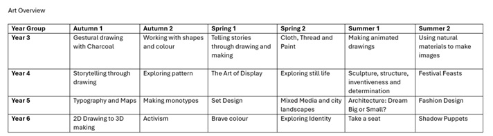 Our Art curriculum is taught using Access Art’s scheme of work. This ensures that previous skills and knowledge are returned to and built upon. This allows pupil progress to be developed as they will be able to undertake more detailed tasks, whilst tackling easier tasks with some understanding and ease. So that pupils take part in a range of art skills and tasks, topics are taught in blocks and relevant to each year group with particular themes, adding context to learning. So that work and artistic talent can be showcased across the school, there is the progression of skills presented within sketchbooks each year, work on display within classrooms and across the school's communal areas and corridors. In class, different local artists’ work is discussed and evaluated as well as great artists and designers in history.